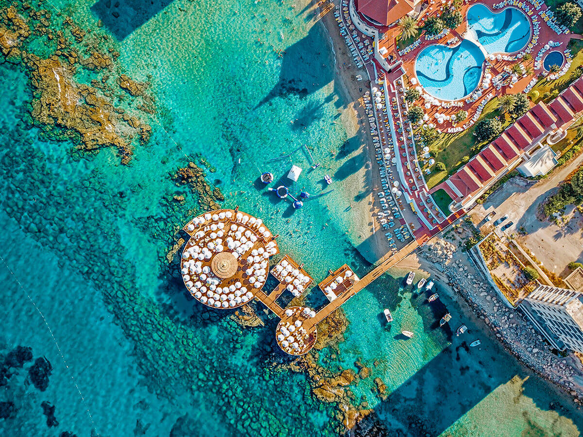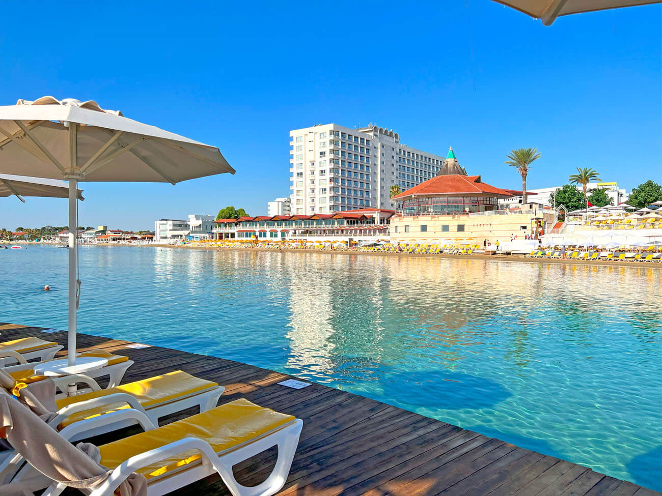 Situated right on the famous golden sands at Famagusta, the resort offers sun loungers beneath shady parasols for relaxing. Enjoy swimming and watersports in the clear turquoise waters of the Mediterranean Sea.