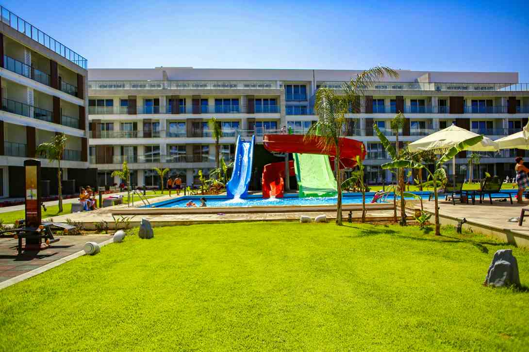 Courtyard Long Beach Resort is one of the best complexes in the Long Beach district famous for its luxurious design and unique location. The apartments offer views of the complex's vibrant infrastructure along with its fully equipped amenities. You can relax on the terrace on a warm evening or take a refreshing dip in the large outdoor pool. With a variety of facilities, including a spa, gym, and mini water park, Courtyard Long Beach Resort has everything you need for a comfortable and fun-filled stay. In addition, the complex is conveniently located just a 10-minute walk away from the sea and the town's many restaurants, shops, and markets, making it the perfect choice for travellers looking to explore Northern Cyprus's unique sights and sounds. The charming courtyard transports you to a Mediterranean lifestyle, offering a unique opportunity to experience the vibrant culture and beauty of the region.
