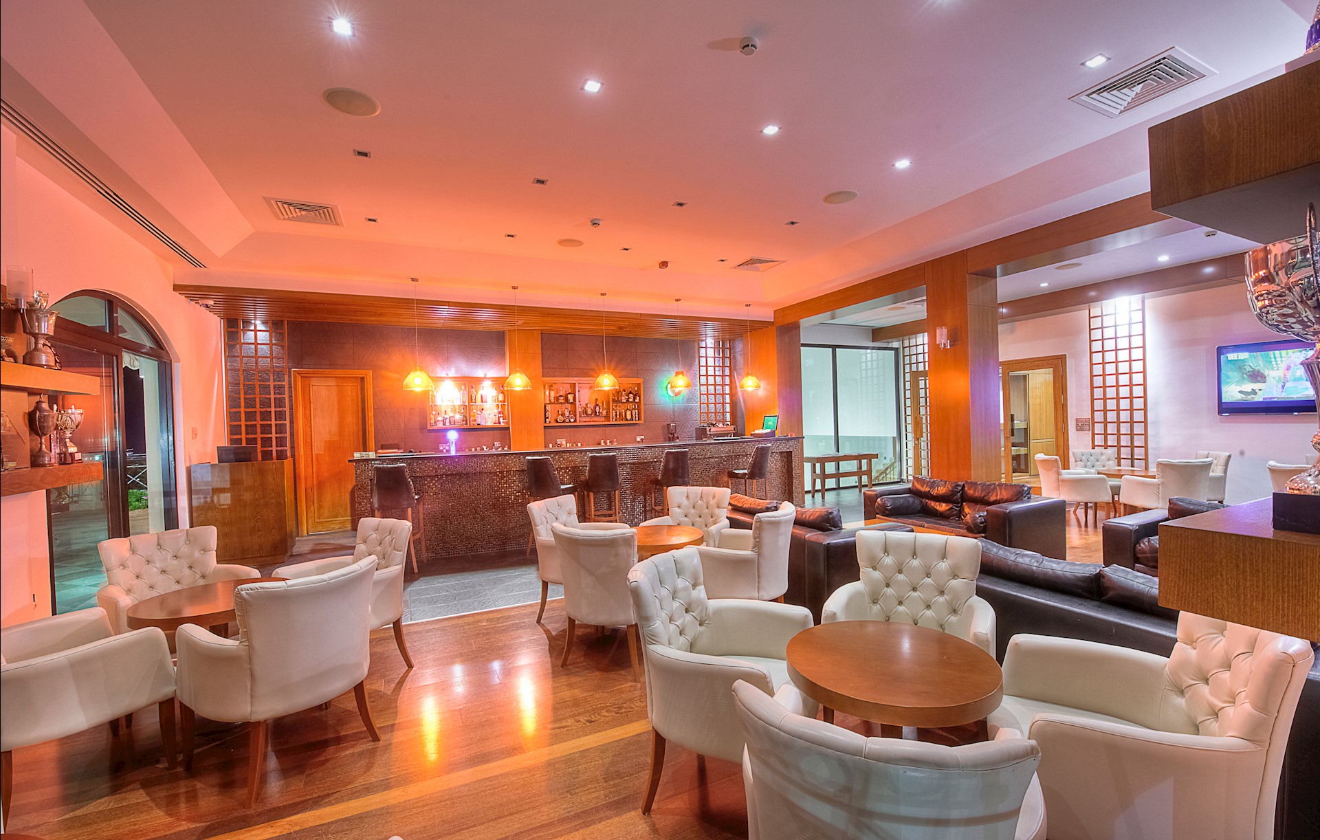 Gourmet dining at the Korineum Spa and Beach Resort is another outstanding benefit of your stay. Look forward to delicious breakfast and dinner buffets in the modern surroundings of the Carob Island Restaurant. Chefs prepare food to order at the hot cooking stations so guests can enjoy their favourite dishes individually cooked to perfection. The Clubbers Bar and Lounge specialises in fusion cuisine with tasty options served in a cosy informal atmosphere at any time of year. During the summer season, the Beach Bar and Sandals Pool Bar serve a huge choice of cool drinks and snacks throughout the day either poolside or down on the beach. The Loggerhead Sports Bar offers traditional pub games with pool tables, darts and card tables in a relaxing lounge setting complete with cosy log fire for cooler evenings. It's a great place to socialise and make new friends over drinks and games. The Academy Shanks Bar is the "19th Hole" for golfers. Located within the Golf Academy, it serves a variety of hot and cold snacks, sandwiches and refreshments. In addition to all these dining options, the Korineum Spa and Beach Resort hosts traditional Cypriot Nights where guests can enjoy Kleftiko (slow roasted lamb) and other authentic Cypriot cuisine. The popular Sunday Brunch is another gourmet feast for guests to look forward to (booking is necessary).